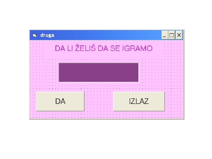 zadatak • Kreirati dvije forme. • Na prvoj formi je 1 labela “da li želiš da se igraš? ”, 1 textbox, i 2 dugmeta (da i izlaz). Prilikom otvaranja forme dugme izlaz nije vidljivo. Ako se u textbox upiše “da” kad se pritisne na dugme DA ulazi se u drugu formu, a ako je upisano nešto drugo dugme IZLAZ postaje vidljivo, a pritiskom na njega izlazi se iz forma. • Na drugoj formi imamo 1 labelu “upiši broj” 1 textbox i 1 dugme PROVJERI. Kad se unese broj u textbox i klikne na dugme provjeri vrši se provjera da li je uneseni broj veći, manji ili jednak broju 10!