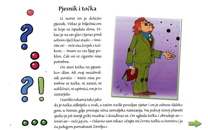 DOBRO JE ZNATI – bjelina Bjelina je prazno mjesto u tekstu koje se nalazi: On stavi točku na pjesnikov dlan. Ali ovaj nezahvalnik poviče: – Meni nisu potrebne točke, ni zarezi, ni uskličnici… sve je to zastarjelo.