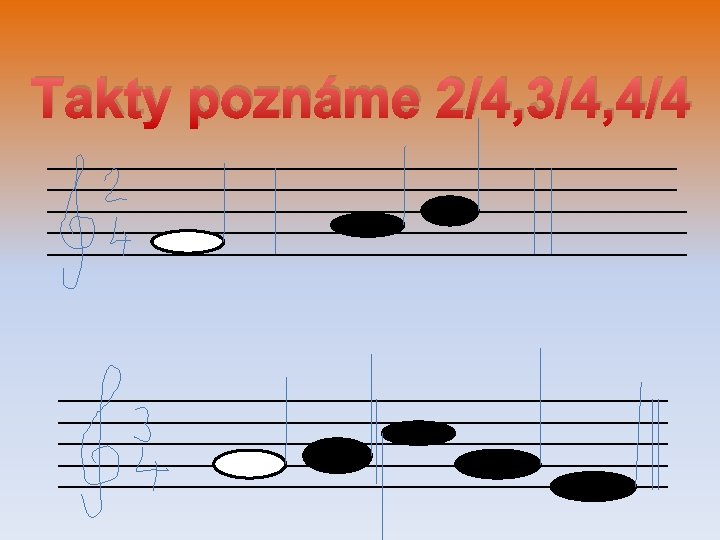 Noty poznáme: • -celé. . . počítame na 4 doby • -pólové. . . počítame na 2 doby • -štvrťové. . . počítame na 1 dobu • -osminové. . . počítame na pol doby