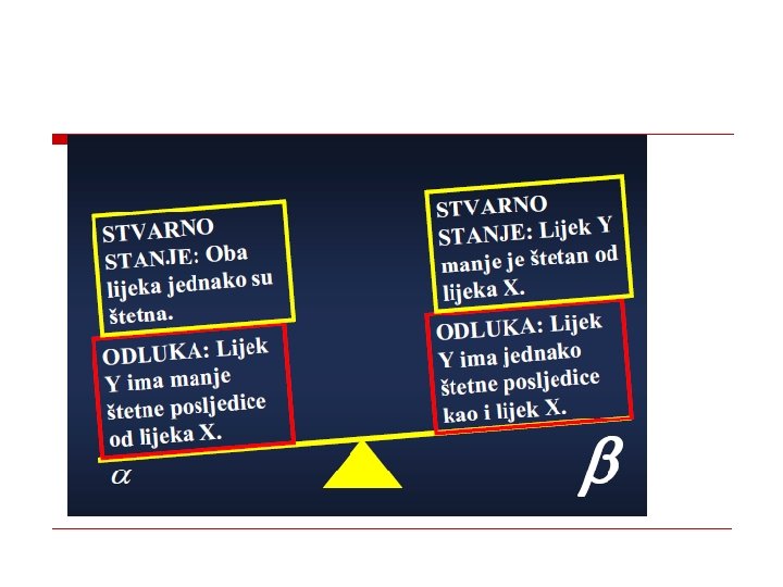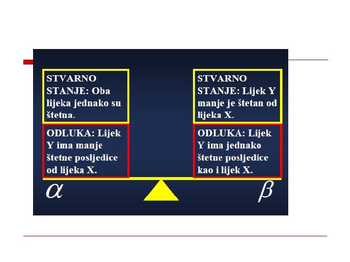 što je greška tipa I ( )? o Vjerojatnost pogrešnoga odbacivanja ništične hipoteze kada je ona točna (… pouzdanost da ćemo isključiti slučajne razlike kao značajne…) Posljedica: o Puštanje neefikasnoga lijeka na tržište!)