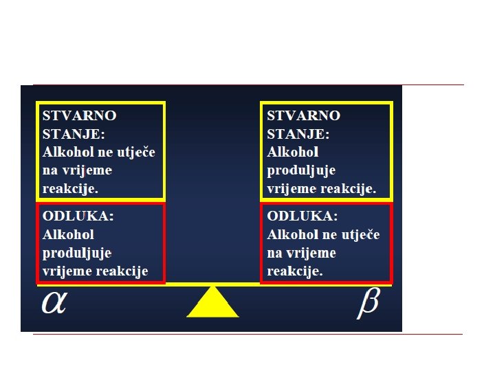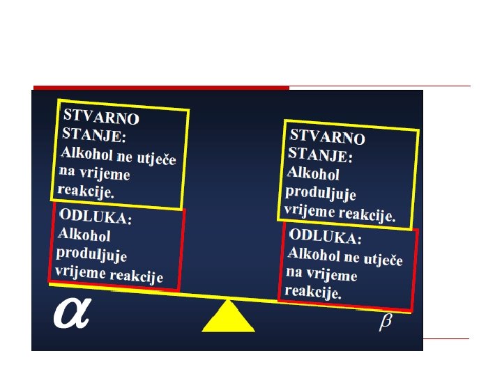 ODABIR RAZINE ZNAČAJNOSTI Pitanje štetnih posljedica pogreške: o 1. Odluka/zaključak da učinak postoji onda kada ga u stvarnosti nema može prouzročiti iznimno štetne posljedice => n smanjiti vjerojatnost nastajanja pogreške tipa 1, tj. odabrati manji α