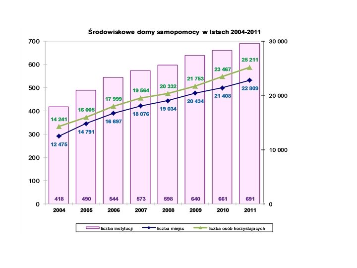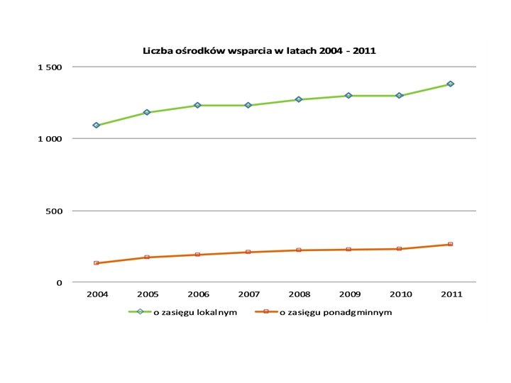 Instytucjonalne formy wsparcia Ośrodki wsparcia wyszczególnienie liczba instytucji OŚRODKI WSPARCIA środowiskowe domy samopomocy 2005 2006 2007 2008 2009 2010 2011 1 222 1 351 1 424 1 440 1 493 1 523 1 530 1 641 liczba miejsc 63 712 65 357 62 455 64 200 63 937 68 536 68 217 77 368 liczba osób korzystających 85 132 98 881 93 919 94 104 94 230 101 792 130 513 120 216 418 490 544 573 598 640 661 691 liczba miejsc 12 475 14 791 16 697 18 076 19 034 20 434 21 408 22 809 liczba osób korzystających 14 241 16 005 17 999 19 564 20 332 21 753 23 467 25 211 liczba instytucji w tym: 2004