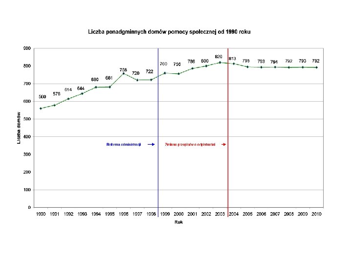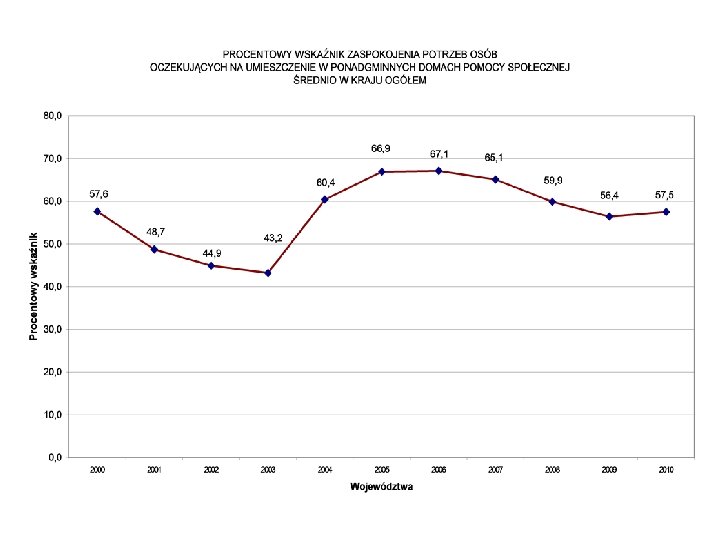 Rozwój ponadgminnych domów pomocy społecznej Rok Liczba domów Licz ba miej sc Liczba mieszka ńców Liczba os. Wskaźnik oczekując umieszczo zaspokoje ych nych w nia potrzeb ciągu roku w% wg stanu na dzień 31. XII. 1990 560 61 037 1991 578 62 519 1992 614 64 844 61 857 1993 644 67 372 64 207 1994 680 69 863 66 135 1995 681 69 000 67 318 1996 758 73 006 67 416 1997 720 70 909 68 092 1998 722 70 477 69 024 1999 760 73 133 72 627 11 175 15 167 57, 6 2000 756 73 363 74 261 2001 786 76 326 77 322 16 268 15 463 48, 7 2002 800 77 731 78 935 18 149 14 764 44, 9 2003 820 80 557 80 588 19 361 14 698 43, 2 2004 813 80 633 6 755 10 307 2005 795 80 226 77 864 5 974 9 158 2006 793 78 918 77 566 6 208 10 376 67, 1 2007 794 78 377 77 246 6 310 10 458 65, 1 2008 792 77 998 77 214 7 837 10 810 59, 9 2009 793 77 711 75 927 7 856 9 199 56, 4 2010 792 77 093 75 738 8 294 9 795 57, 5 79 332 zmiana 60, 4 przepisów o 66, 9 odpłatności