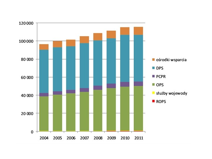 KADRA POMOCY SPOŁECZNEJ Zatrudnienie w jednostkach organizacyjnych pomocy społecznej rok ROPS służby wojewody OPS PCPR DPS ośrodki wsparcia 2004 188 390 38 076 3 658 48 078 6 302 2005 205 397 39 887 3 826 48 900 6 835 2006 206 360 41 484 3 910 48 429 6 949 2007 309 356 42 907 4 223 49 796 7 757 2008 420 377 44 971 4 674 50 281 8 120 2009 508 419 46 772 5 120 50 199 8 567 2010 582 494 48 244 5 401 52 069 8 716 2011 658 464 49 004 5 072 51 712 8 882