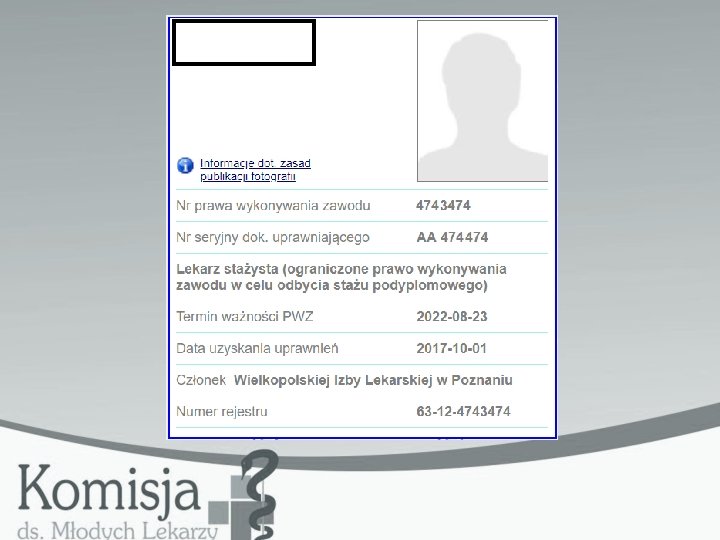 Modyfikacja uprawnień „Informacja dodatkowa”: − Grupa biznesowa „Absolwent” − Grupa funkcjonalna „Użytkownik” − Jednostka akceptująca wniosek – Okręgowa Izba lekarska (WIL w Poznaniu)