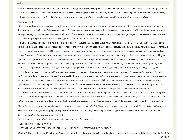 Serbische Herrscherurkunden (1306– 88) • A test collection containing 18 documents of several rulers • Document images of various quality (photos, book scans) • Different archival provenance (Athos monasteries, Dubrovnik, Belgrade, Cetinje, Venice, Bari) • Presentation format: Ø document name (yyyymmdd – issuer) Ø additional date information (byz, cca, taq/tpq, ? ) Ø abstract and diplomatic analysis (in German) Ø full text of the existing editions (xml, CEI standard); Old Slavonic letters transcribed pursuant to the Unicode Standard 5. 1, Cyrillic