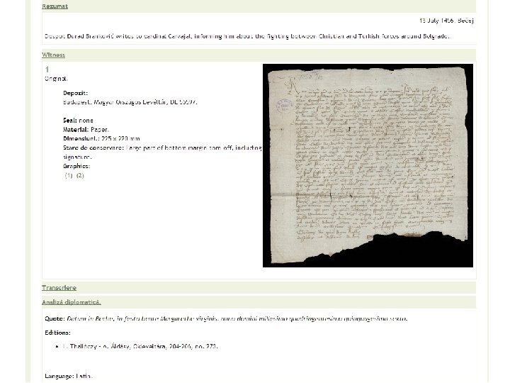 Currently available collections • Selected Serbian royal documents from the 14 th century (Serbische Herrscherurkunden, 1306– 88) • Serbian Royal Documents at the State Archives in Dubrovnik (1186 -1479) • Serbian Charters in Archives of Hungary (1411 -1481)