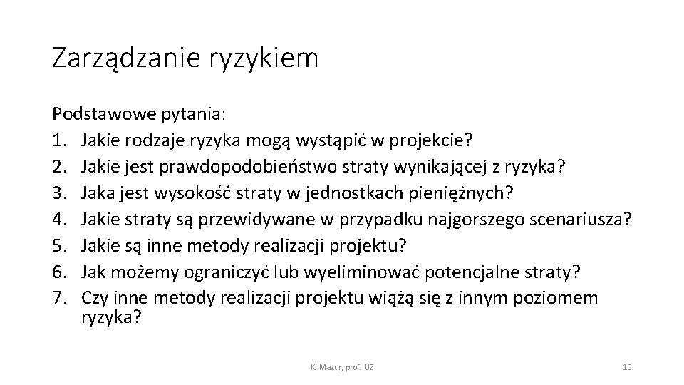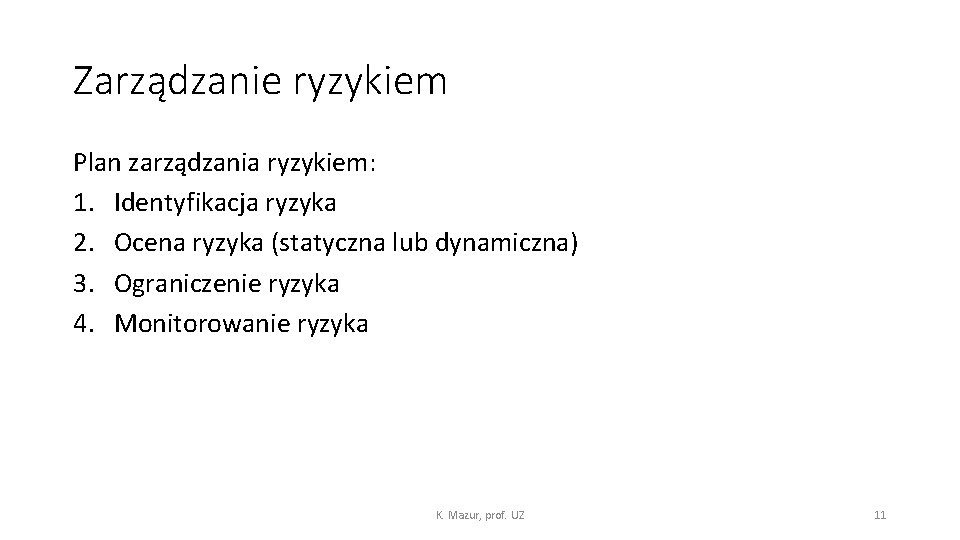Zarządzanie ryzykiem Podstawowe pytania: 1. Jakie rodzaje ryzyka mogą wystąpić w projekcie? 2. Jakie jest prawdopodobieństwo straty wynikającej z ryzyka? 3. Jaka jest wysokość straty w jednostkach pieniężnych? 4. Jakie straty są przewidywane w przypadku najgorszego scenariusza? 5. Jakie są inne metody realizacji projektu? 6. Jak możemy ograniczyć lub wyeliminować potencjalne straty? 7. Czy inne metody realizacji projektu wiążą się z innym poziomem ryzyka? K. Mazur, prof. UZ 10