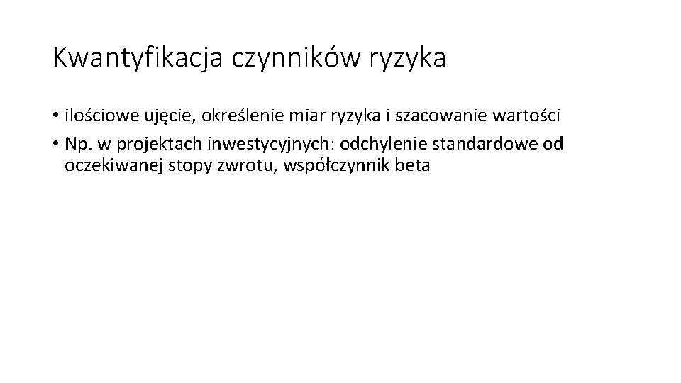 Kwantyfikacja czynników ryzyka • ilościowe ujęcie, określenie miar ryzyka i szacowanie wartości • Np. w projektach inwestycyjnych: odchylenie standardowe od oczekiwanej stopy zwrotu, współczynnik beta