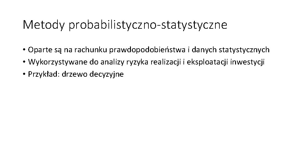 Metody probabilistyczno-statystyczne • Oparte są na rachunku prawdopodobieństwa i danych statystycznych • Wykorzystywane do analizy ryzyka realizacji i eksploatacji inwestycji • Przykład: drzewo decyzyjne