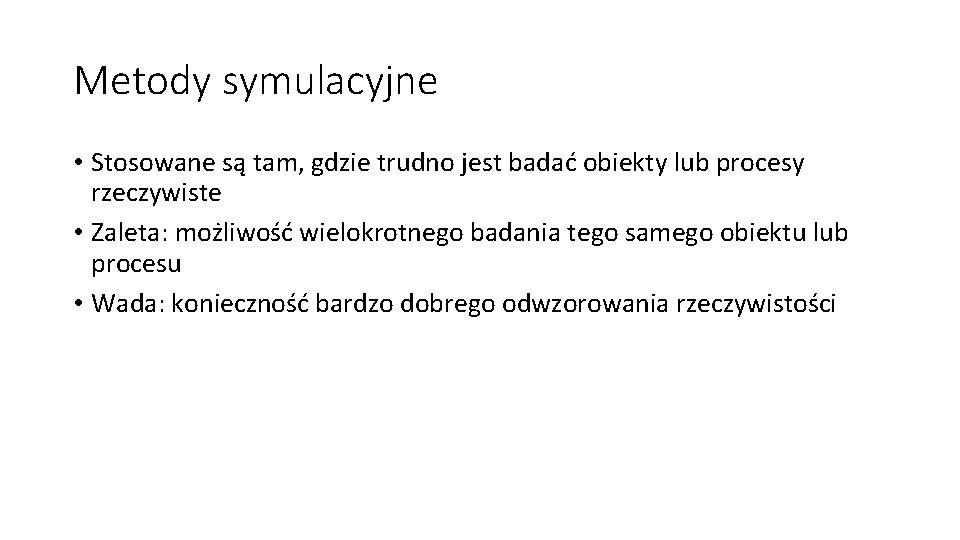 Metody symulacyjne • Stosowane są tam, gdzie trudno jest badać obiekty lub procesy rzeczywiste • Zaleta: możliwość wielokrotnego badania tego samego obiektu lub procesu • Wada: konieczność bardzo dobrego odwzorowania rzeczywistości