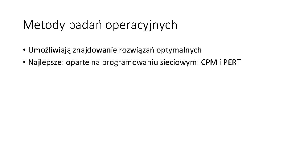 Metody badań operacyjnych • Umożliwiają znajdowanie rozwiązań optymalnych • Najlepsze: oparte na programowaniu sieciowym: CPM i PERT