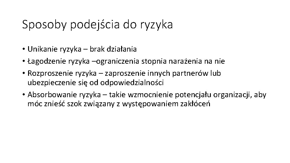 Sposoby podejścia do ryzyka • Unikanie ryzyka – brak działania • Łagodzenie ryzyka –ograniczenia stopnia narażenia na nie • Rozproszenie ryzyka – zaproszenie innych partnerów lub ubezpieczenie się od odpowiedzialności • Absorbowanie ryzyka – takie wzmocnienie potencjału organizacji, aby móc znieść szok związany z występowaniem zakłóceń