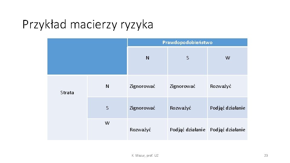 Przykład macierzy ryzyka Prawdopodobieństwo N Strata S W N Zignorować Rozważyć S Zignorować Rozważyć Podjąć działanie Rozważyć Podjąć działanie W K. Mazur, prof. UZ 23