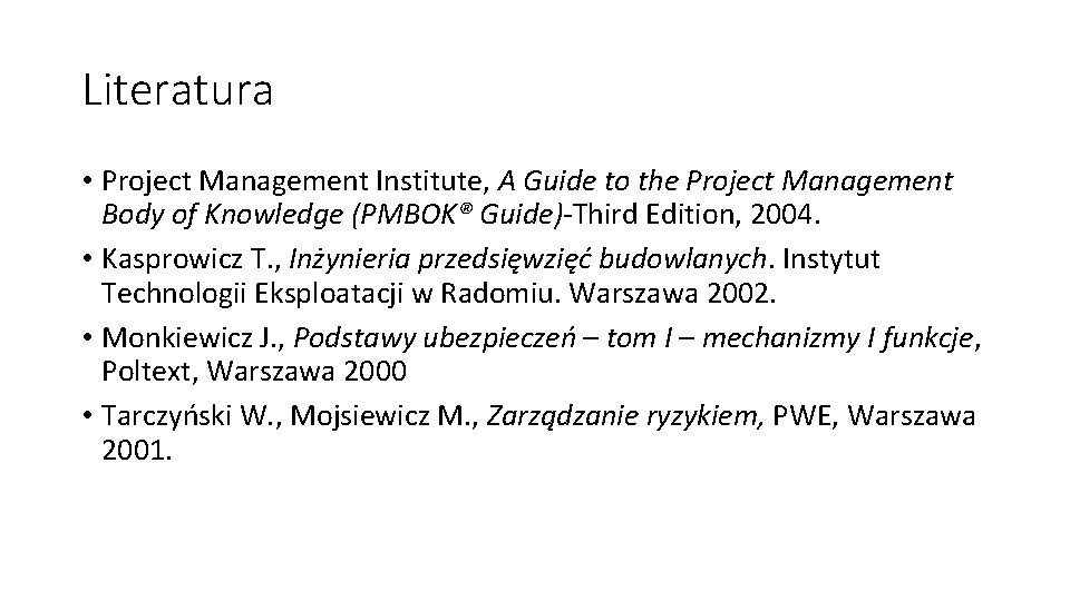 Literatura • Project Management Institute, A Guide to the Project Management Body of Knowledge (PMBOK® Guide)-Third Edition, 2004. • Kasprowicz T. , Inżynieria przedsięwzięć budowlanych. Instytut Technologii Eksploatacji w Radomiu. Warszawa 2002. • Monkiewicz J. , Podstawy ubezpieczeń – tom I – mechanizmy I funkcje, Poltext, Warszawa 2000 • Tarczyński W. , Mojsiewicz M. , Zarządzanie ryzykiem, PWE, Warszawa 2001.