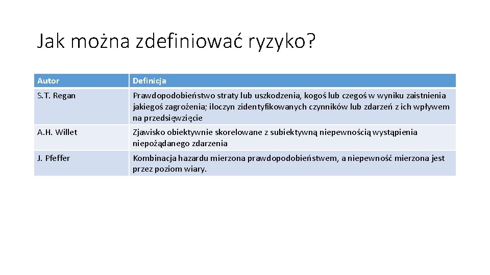 Jak można zdefiniować ryzyko? Autor Definicja S. T. Regan Prawdopodobieństwo straty lub uszkodzenia, kogoś lub czegoś w wyniku zaistnienia jakiegoś zagrożenia; iloczyn zidentyfikowanych czynników lub zdarzeń z ich wpływem na przedsięwzięcie A. H. Willet Zjawisko obiektywnie skorelowane z subiektywną niepewnością wystąpienia niepożądanego zdarzenia J. Pfeffer Kombinacja hazardu mierzona prawdopodobieństwem, a niepewność mierzona jest przez poziom wiary.