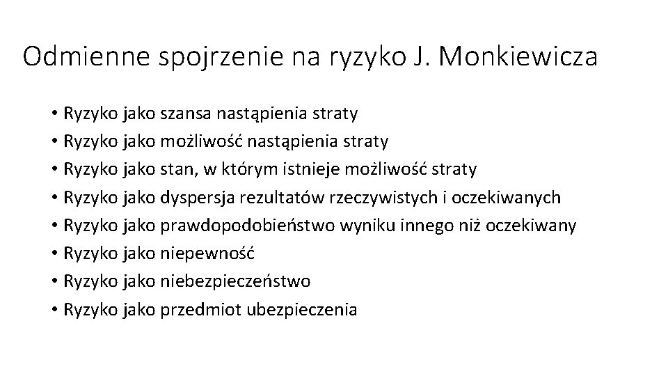 Odmienne spojrzenie na ryzyko J. Monkiewicza • Ryzyko jako szansa nastąpienia straty • Ryzyko jako możliwość nastąpienia straty • Ryzyko jako stan, w którym istnieje możliwość straty • Ryzyko jako dyspersja rezultatów rzeczywistych i oczekiwanych • Ryzyko jako prawdopodobieństwo wyniku innego niż oczekiwany • Ryzyko jako niepewność • Ryzyko jako niebezpieczeństwo • Ryzyko jako przedmiot ubezpieczenia