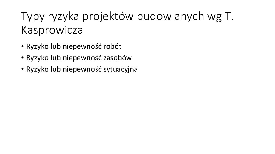 Typy ryzyka projektów budowlanych wg T. Kasprowicza • Ryzyko lub niepewność robót • Ryzyko lub niepewność zasobów • Ryzyko lub niepewność sytuacyjna