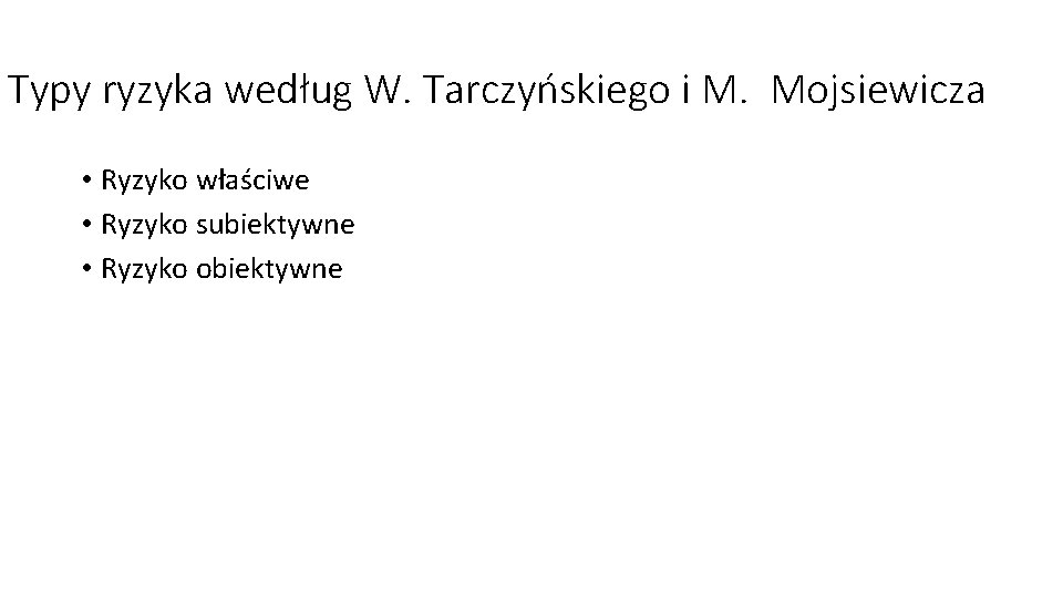 Typy ryzyka według W. Tarczyńskiego i M. Mojsiewicza • Ryzyko właściwe • Ryzyko subiektywne • Ryzyko obiektywne