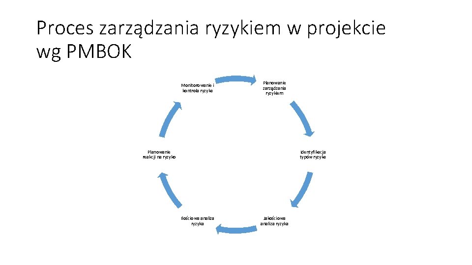 Proces zarządzania ryzykiem w projekcie wg PMBOK Monitorowanie i kontrola ryzyka Planowanie zarządzania ryzykiem Planowanie reakcji na ryzyko Identyfikacja typów ryzyka Ilościowa analiza ryzyka Jakościowa analiza ryzyka