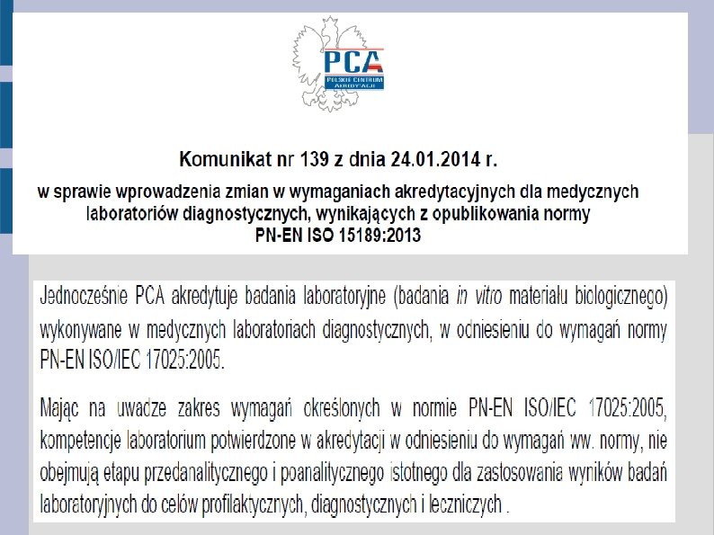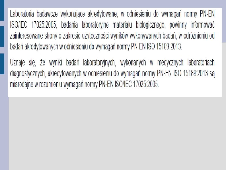 Specyfika MLD Klient = pacjent / lekarz , obsługa klienta (w tym pobieranie materiału) 24 -h dostępność badań i DL (konsultacja specjalisty) Wyrób = Usługa laboratoryjna (od pobrania do wydania sprawozdania z badań) Proces diagnostyczny / Procesy pomocnicze / Procesy zarządcze Produkt = sprawozdanie z badań Wiarygodność wyniku zapewnia system sterowania jakością badań Konsultacja merytoryczna z DL – wymóg prawny! Zgodność z wymaganiami merytorycznymi dla MLD Należy zapewnić zgodność z wymaganiami dla MLD: 8 aktów prawnych, 12 Rozporządzeń MZ, Standardy akredytacyjne dla szpitali, normy międzynarodowe, zalecenia towarzystw naukowych, konsultantów, WHO.
