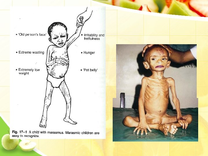 Marasmus • Tanda-tanda – BB/TB -3 SD – Sangat kurus, tangan dan kaki sangat kecil (LILA 10 -11 cm) – Wajah tampak tua (selalu terlihat cemas dan muram) – Baggy pants (kulit daerah pantat berlipat) – Perut buncit – Sangat peka/sensitif/cengeng – Terlihat sangat lapar/rakus jika diberi makan