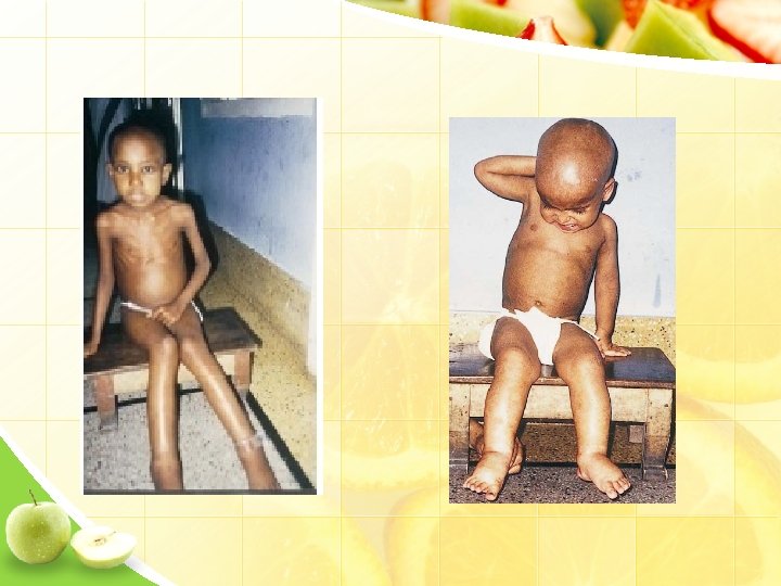 Tanda-tanda kwashiorkor Tanda-tand Oedema pada lengan, tangan & wajah Wajah bulat seperti bulan (moon face) BB/U < atau > -3 rd SD perut buncit Apatis dan cengeng Hilang selera/nafsu makan Kulit berwarna pucat, mengelupas/mengeriput Rambut tipis, mudah rontok, berwarna merah Pembengkakan hati karena pengaruh radikal bebas