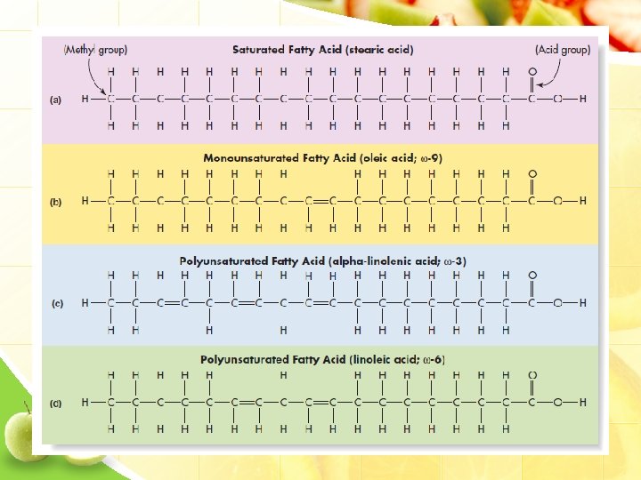 Tingkat Kejenuhan Asam lemak jenuh Asam lemak tidak jenuh -terdiri dari rantai C yang mengikat semua H -mengandung > 1 ikatan rangkap, dimana sebenarnya dapat diikat tambahan atom H -MUFA (AL tidak jenuh tunggal) mengandung 1 ikatan rangkap -PUFA (AL tidak jenuh ganda) mengandung > 2 ikatan rangkap -ALTJ umumnya cair pada suhu ruang & titik cair lbh rendah dari ALJ