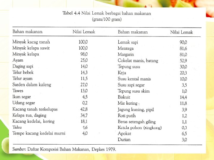 3. 7 Sumber Lemak • Lemak nabati – Minyak tumbuhan (kelapa, kelapa sawit, kacang tanah, kedelai, jagung, zaitun, biji bunga matahari, wijen) – Margarin • Lemak hewani – Lemak hewan/gajih – Mentega, Krim, Susu, Keju – Kuning telur