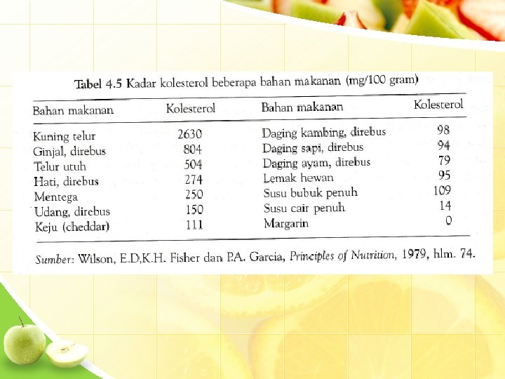3. 6 Kebutuhan Lemak • WHO 15 -30% kebutuhan E total – Cukup sbg sb asam lemak esensial, membantu penyerapan vit larut lemak – 10% lemak jenuh, 3 -7% lemak tidak jenuh ganda • Konsumsi kolesterol maks 300 mg/hr • WNPG 2012 1 -3 tahun 35% total energi 4 -18 thn 30% dewasa 25%