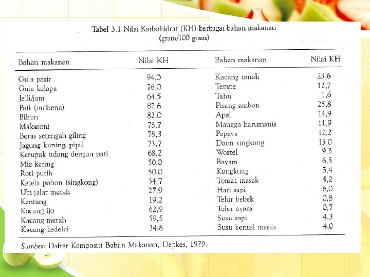 Fungsi • Pengatur metabolisme lemak – Mencegah oksidasi lemak tidak sempurna yg menghasilkan bahan keton (ketosis) • Membantu mengeluarkan feses – Selulosa mengatur peristaltik usus, memberi bentuk feses memudahkan defekasi • Laktosa lebih lama tinggal dlm saluran cerna pertumbuhan bakteri baik sintesa vit K Laktosa susu meningkatkan absorbsi Ca Serat dapat menurunkan kolesterol