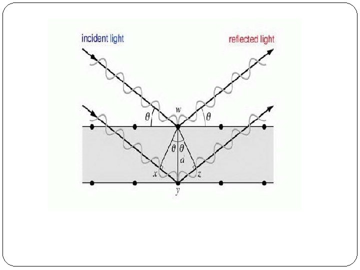 2. struktur kristal dan difraksi sinar X � Persamaan yang menghubungkan variabel ini adalah persamaan Bragg atau dengan, n λ d θ =bilangan bulat 1, 2, 3, …=orde pantulan =panjang gelombang sinar X =jarak antar bidang =jarak antar sinar datang dan bidang kisi = jarak antar bidang indeks miller