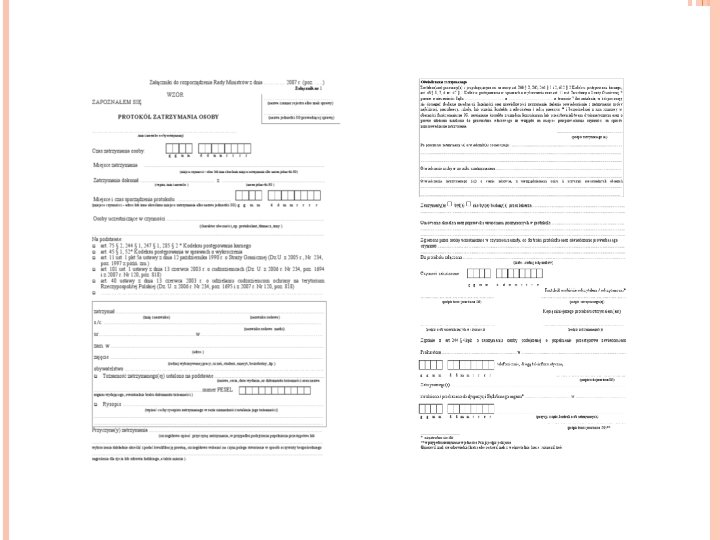 OBOWIĄZKI ORGANU UPRAWNIONEGO DO ZATRZYMANIA Natychmiastowe pouczenie zatrzymanego o przyczynie zatrzymania i przysługujących mu uprawnieniach, w tym prawie do skorzystania z pomocy adwokata lub radcy prawnego oraz wysłuchania go (art. 244 § 2) Sporządzenie protokołu zatrzymania – szczególne elementy (art. 244 § 3 k. p. k. ) Wręczenie odpisu protokołu zatrzymanemu (art. 244 § 3 k. p. k. ) Zawiadomienie prokuratora o fakcie zatrzymania (art. 244 § 4 k. p. k. ) Niezwłoczne przystąpienie do zbierania niezbędnych danych (art. 244 § 4 k. p. k. ) Wystąpienie do prokuratora z wnioskiem o skierowanie do sądu wniosku o tymczasowe aresztowanie jeżeli istnieją przesłanki z art. 258 § 1 -3 (art. 244 § 4 k. p. k. ) Zwolnienie zatrzymanego, jeżeli zajdą odpowiednie przesłanki (art. 248 k. p. k. )