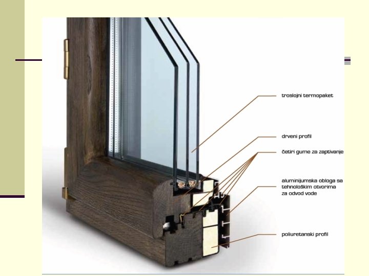 Drveni prozor sa Al eloksiranom oblogom sa spoljašnje strane i aluminijumskom okapnicom Izopan paket 4+16+4 Aluminijumska obloga drvo Aluminijumska okapnica