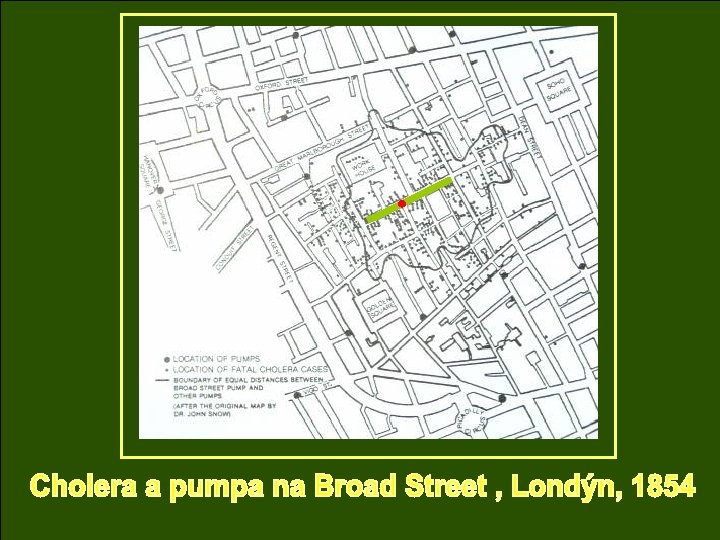 JOHN SNOW (1813 – 58) 1. Popsal výskyt nemoci 2. Indentifikoval rizikový faktor (determinantu) nemoci. 3. Zasadil se o přijetí opatření, které vedlo k odstranění této determinanty