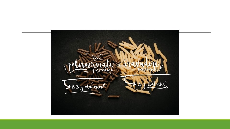 Zakaj priporočamo polnozrnata živila? • 1. Polnovredni (polnozrnati) žitni izdelki vsebujejo več prehranske vlaknine, vitaminov, mineralov, ker v procesu mletja zrnja ni bila odstranjena luska s tem pa tudi ne minerali in vitamini, kot pri beli moki in izdelkih iz bele moke. • 2. Polnozrnata živila imajo nizek glikemični indeks… Kaj to pomeni? • Polnozrnata živila se počasi presnavljajo in s tem je porast glukoze v krvi počasnejši in smo dlje časa siti. • Rafinirana živila (bela moka, bele testenine, bel kruh. . ) se hitro presnavljajo in s tem je hiter porast glukoze v krvi kar ima za posledico, da smo hitro lačni.