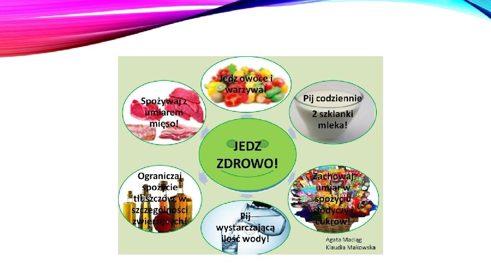 ZASADY ZDROWEGO ODŻYWIANIA 1. � Dbaj o różnorodność spożywanych produktów. 2. Produkty zbożowe powinny być dla Ciebie głównym źródłem energii (kalorii). 3. Spożywaj codziennie co najmniej dwie duże szklanki mleka. Mleko można zastąpić jogurtem, kefirem, a częściowo także serem. 4. �Mięso spożywaj z umiarem. 5. �Spożywaj codziennie dużo warzyw i owoców. 6. Ograniczaj spożycie tłuszczów, w szczególności zwierzęcych, a także produktów zawierających dużo cholesterolu i izomery trans nienasyconych kwasów tłuszczowych. 7. Zachowaj umiar w spożyciu cukru i słodyczy. 8. �Ograniczaj spożycie soli. 9. Pij wystarczającą ilość wody (co najmniej 1, 5 l dziennie).