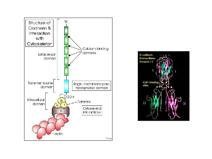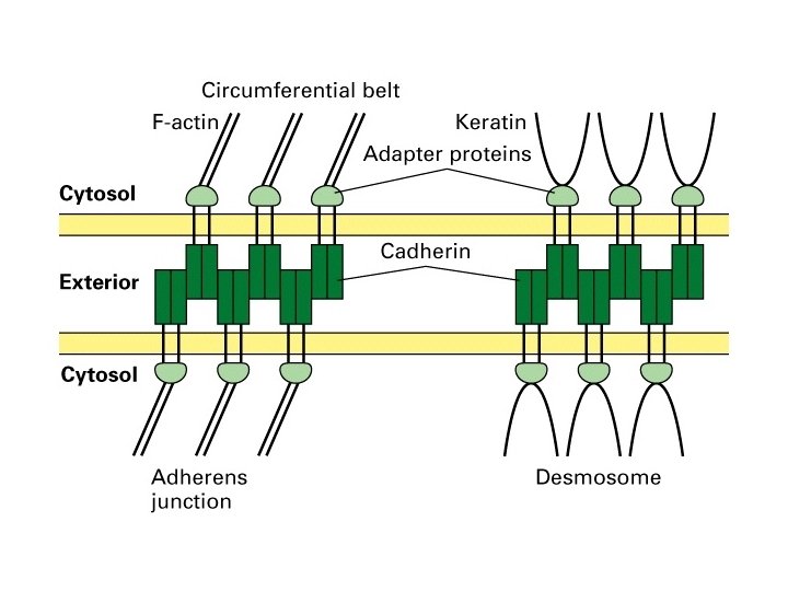 Medcelične povezave s kadherini • adherenčni stiki: pri epitelijskih celicah stiki, sestavljeni iz kateninov, ki povezujejo E-kadherine z aktinom in miozinom • desmosomi: proteinske lehe iz plakoglobina so povezane s transmembrankimi linkerji (desmoglein, desmokolin)
