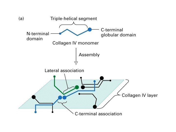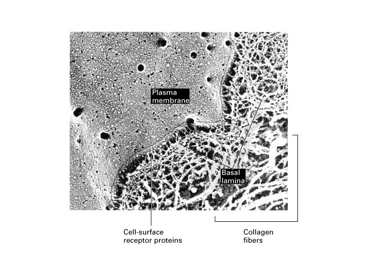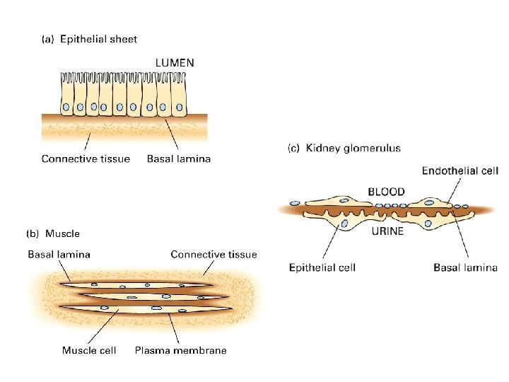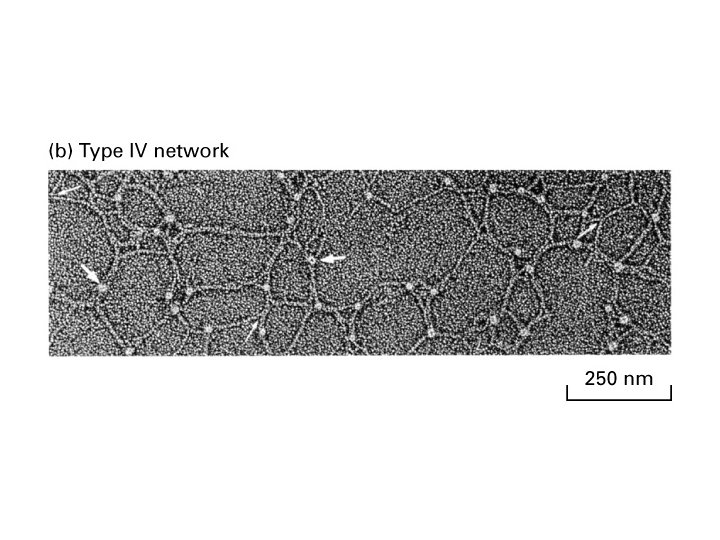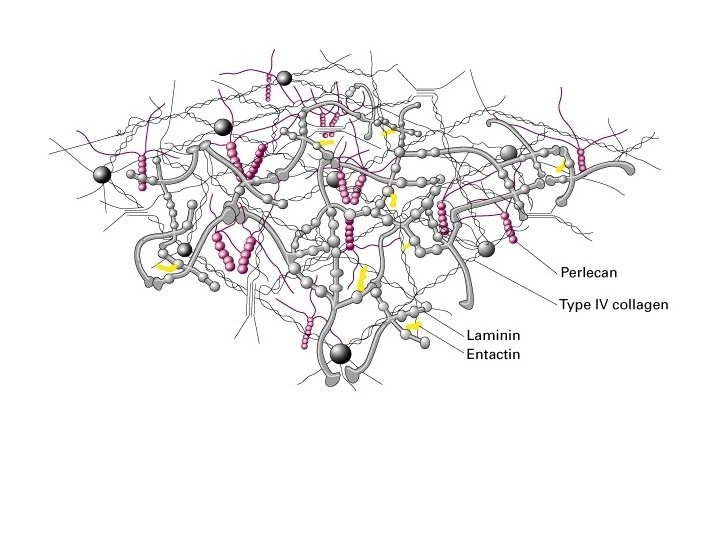 Bazalna lamina • • • 60 nm – 100 nm debela plošča sestavljena iz komponent ECM podlaga za epitelijske in endotelijske celice obkrožajo mišične celice in adipocite večinski komponenti sta kolagen IV in laminin