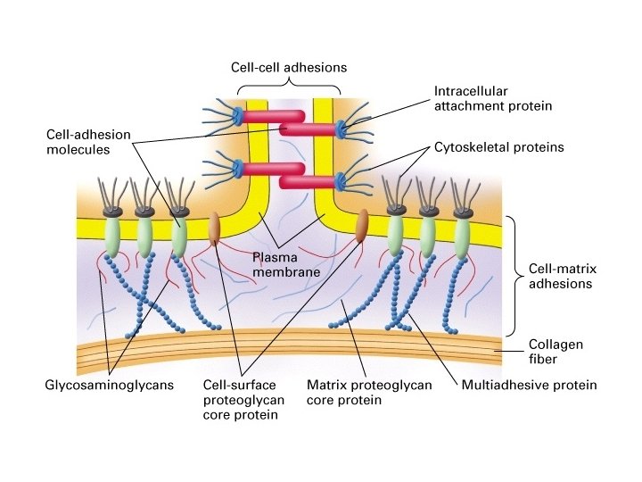 Proteinske sestavine medceličnine • proteoglikani: viskozni, varujejo celice • kolagenska vlakna: čvstost • multiadhezijski proteini: povezava ostalih sestavin s površinskimi receptorji