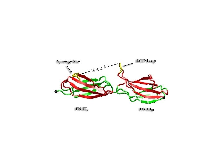 Zgradba fibronektina (1/2 dimera): ~2500 AK, 3 tipi ponovitev zaporedja v 6 domenah, ki vsaka veže določeno vrsto drugih molekul.