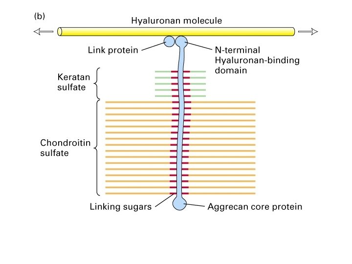 Proteoglikanski agregat v hrustancu: osrednji protein (agrekan) se povezuje v 40 nm intervalih s Agrekan (250 k. Da) + GAG 2 MDa, celoten agregat >200 MDa.