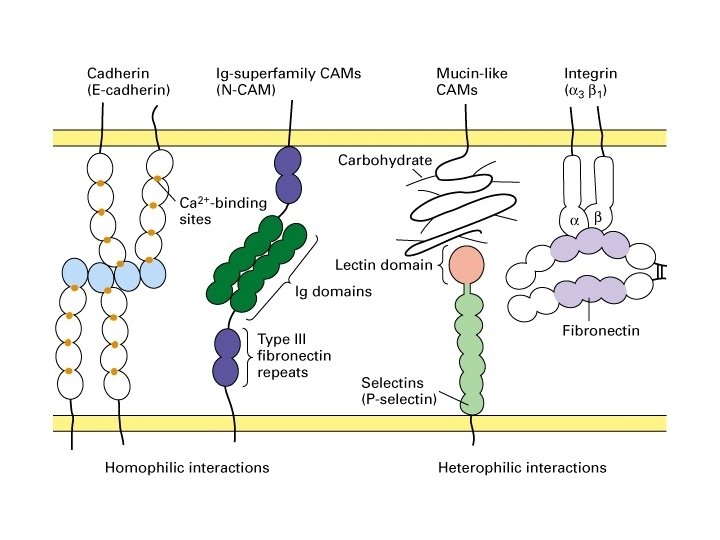 Adhezijske molekule (CAMs) • • • kadherini: odvisni od Ca 2+ naddružina imunoglobulinov selektini: odvisni od Ca 2+ mucini integrini: povezovanje celic z medceličnino