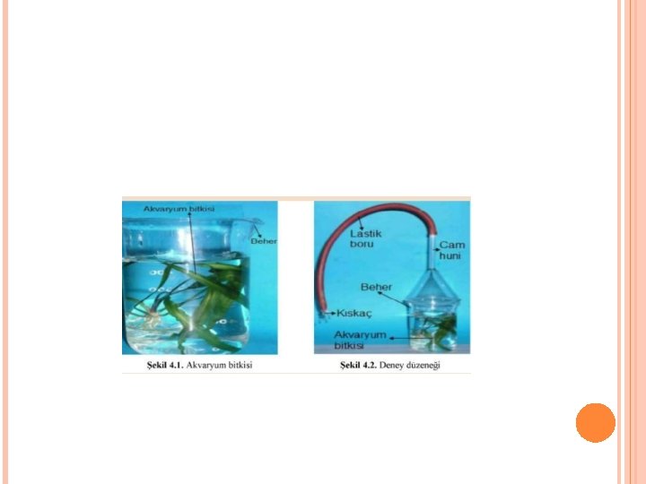 ETKINLIK 2 DENEYİN AMACI : Fotosentezin gerçekleşmesinde karbondioksitin etkisini ve fotosentez sonucu açığa çıkan maddeleri saptamak. KULLANILAN MALZEMELER: Elodea veya herhangi bir akvaryum bitkisi, beher, cam huni, plastik boru, kıskaç, karbondioksitli su (gazoz veya soda), tıpalı huni. DENEYİN YAPILIŞI, ANALİZİ VE DEĞERLENDİRİLMESİ: 1. Elodea veya herhangi bir akvaryum bitkisi su ile doldurulmuş beher içerisine konularak üzeri cam huni ile kapatılır (Şekil 4. 1). 2. Huninin dışarıda kalan ucuna lastik boru geçirilerek ucu kıskaç ile sıkıştırılır. Sonra huni biraz yukarıya kaldırılarak ışık alan yere bırakılır (Şekil 4. 2). 3. Bir süre sonra hava kabarcıklarının çıktığı görülür. Çıkan bu gazın ne olduğunu öğrenebilmek için vanayı veya kıskacı açarak yanan bir kibriti veya çakmağı huninin üst kısmına tutunuz (Şekil 4. 3). 4. Sonra deney düzeneğini eski haline getirerek (kıskacı kapatıp), beherdeki suya karbondioksitli su (soda) ilave ediniz. Bir süre bekledikten sonra gözlemlerinizi yazınız