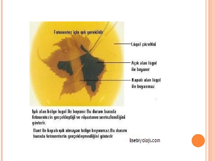 4. DERINLEŞTIRME Etkinlik : Bitkilerin fotosentez yapıp yapmadıklarını basit bir deneyle anlayabilirsiniz. Bunun için bitki yaprağına iyot çözeltisi damlatmanız yeterlidir. Çünkü iyot, nişastanın ayıracıdır ve nişastanın bulunduğu bölgeyi mavi – mor renge boyar. Fotosentez sonucu oluşan glikoz molekülleri birleştirilerek nişastaya dönüştürülür. Bu nişasta, bitkilerin yapısında depolanır. Bundan dolayı bitkilerde ışık alan yapraklara iyot çözeltisi damlatırsanız yaprağın mavi – mor renge dönüştüğünü gözlemlersiniz.