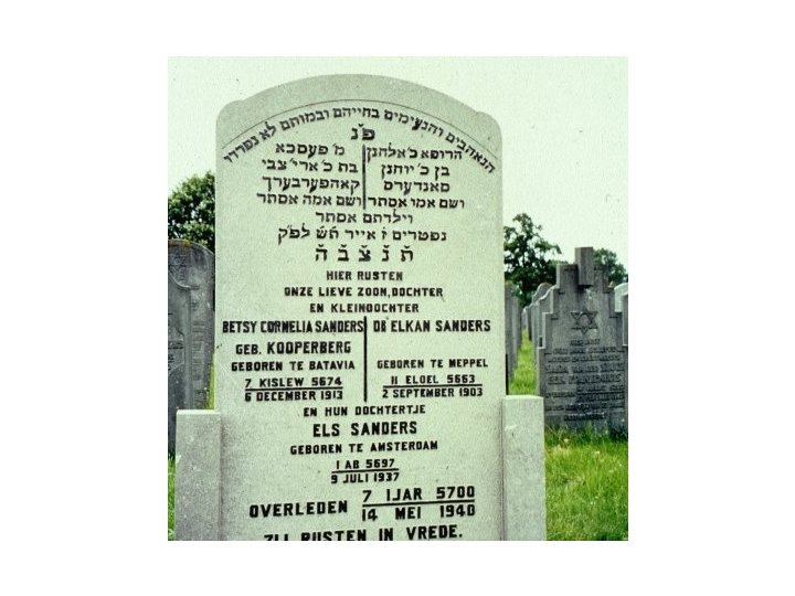 A. J. Herzberg, Kroniek der jodenvervolging, Amsterdam, 1950, blz. 11: ‘Het moet op deze dagen druk zijn geweest in de ziekenhuizen, niet of niet alleen met oorlogsgewonden, maar ook met mensen die niet mee wilden gaan met de nieuwe tijd, en liever de oude, die was gestorven volgden. Dat waren niet uitsluitend Joden, doch wel voor verreweg het grootste deel. Wie het niet geloven wil, die moet de Joodse begraafplaatsen maar bezoeken, en de zerken tellen, die de datum van 15, 16 Mei 1940 en volgende dagen vermelden. Hij zal ook brede grafstenen vinden, waarop een man met zijn vrouw en hun kinderen zijn vermeld. ’
