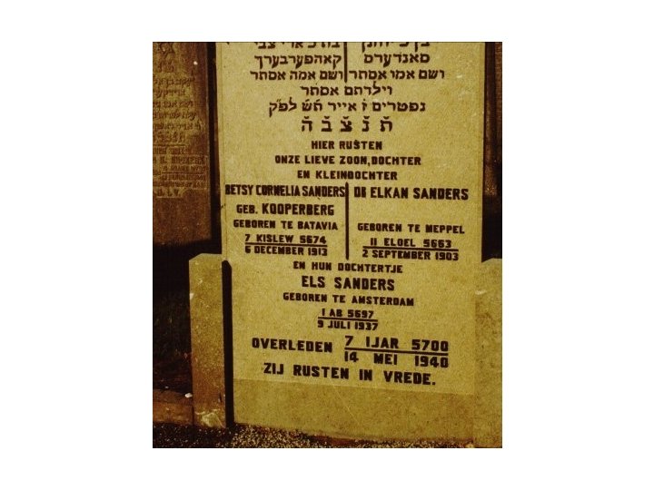 Op een congres te Jeruzalem in 1998 over de geschiedenis van de Joden in Nederland heb ik een voordracht gehouden over mijn bevindingen over zelfdoding van Joden in Nederland tijdens de Tweede Wereldoorlog. Ik dacht dat het een wetenschappelijk congres, met geleerden, zou zijn. Er zaten echter veel personen in de zaal die na de oorlog naar Israël waren gegaan; het congres leek een beetje op een reünie. Na mijn voordracht kwam er een man op me af die vertelde dat zijn vrouw van Nederlandse afkomst was, Sanders heette en zei dat zijn vrouw hem had verteld dat een oom en tante in mei 1940 in Amsterdam zelfmoord pleegden met hun kind. Kon dat kloppen? Omdat ik het Centraal Bureau voor de Statistiek had beloofd niets te vertellen over namen op telkaarten, heb ik de man toen de vorige foto gestuurd. Als bedankje kreeg ik een fotoboek over Israël terug.