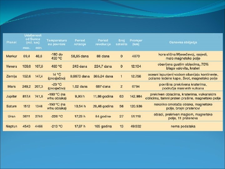Sunčev sustav: -1 zvijezda Sunce -Astronomska jedinica (AJ) – udaljenost od Zemlje do Sunca 150 milijuna km - 8 planeta - unutarnji ili čvrsti: Merkur, Venera, Zemlja i Mars - vanjski ili plinoviti: Jupiter, Saturn, Uran i Neptun - sateliti ili mjeseci - asteroidi ili planetoidi (između Marsa i Jupitera) - kometi – “zvijezde repatice” (dalje od Neptuna) - meteori – manja tijela od asteroida (meteoridi, meteoriti) - međuplanetarni prah i plin - Jurij Gagarin – 1961. prvi čovjek u svemiru - Neil Armstrong – 1969. prvi čovjek na Mjesecu