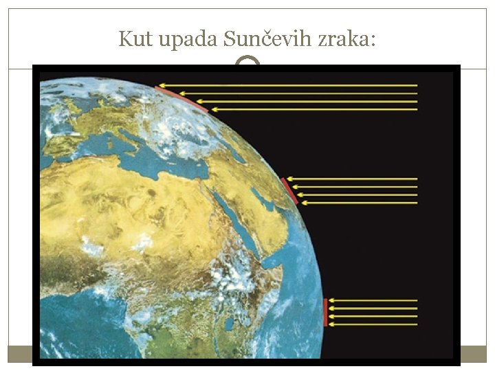 Temperatura zraka �Otkud Zemlji, njezinoj površini i atmosferi toplina? �(od Sunca) �Zašto je najtoplije pri površini Zemlje? �Sunčeve zrake zagrijavaju površinu Zemlje koja grije zrak.