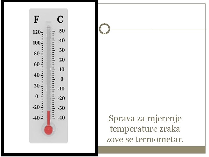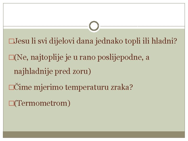 �Jesu li svi dijelovi dana jednako topli ili hladni? �(Ne, najtoplije je u rano poslijepodne, a najhladnije pred zoru) �Čime mjerimo temperaturu zraka? �(Termometrom)
